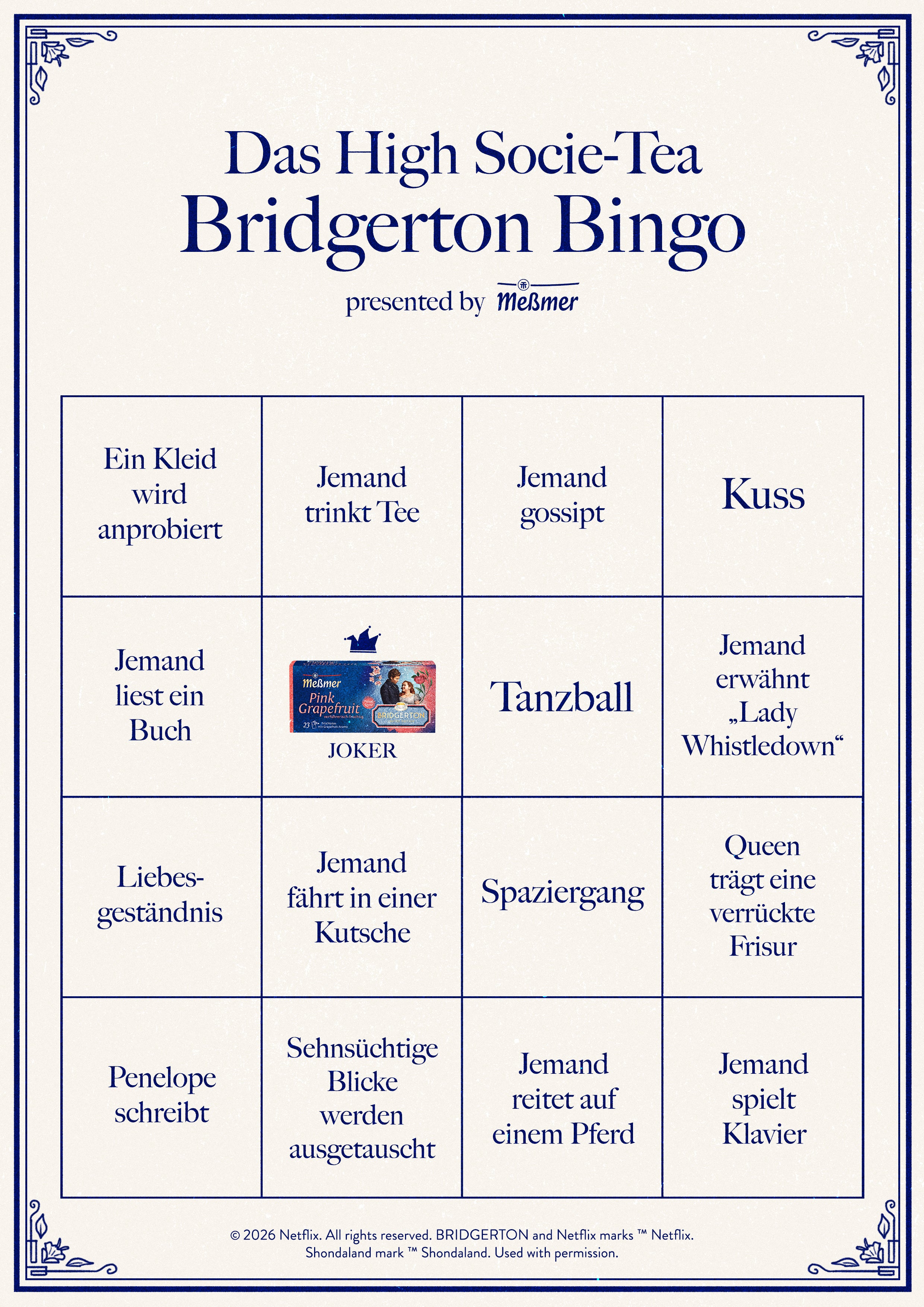 Die neue Bridgerton Staffel ist da! Zur Feier des Releases gibt es von uns das exklusive High Socie-Tea Bridgerton Bingo presented by Meßmer. Mach deine Watchparty zur ultimativen Fan-Experience und fieber mit deinen Freund:innen dem ersten Bingo entgegen. Einfach herunterladen und loskreuzen!